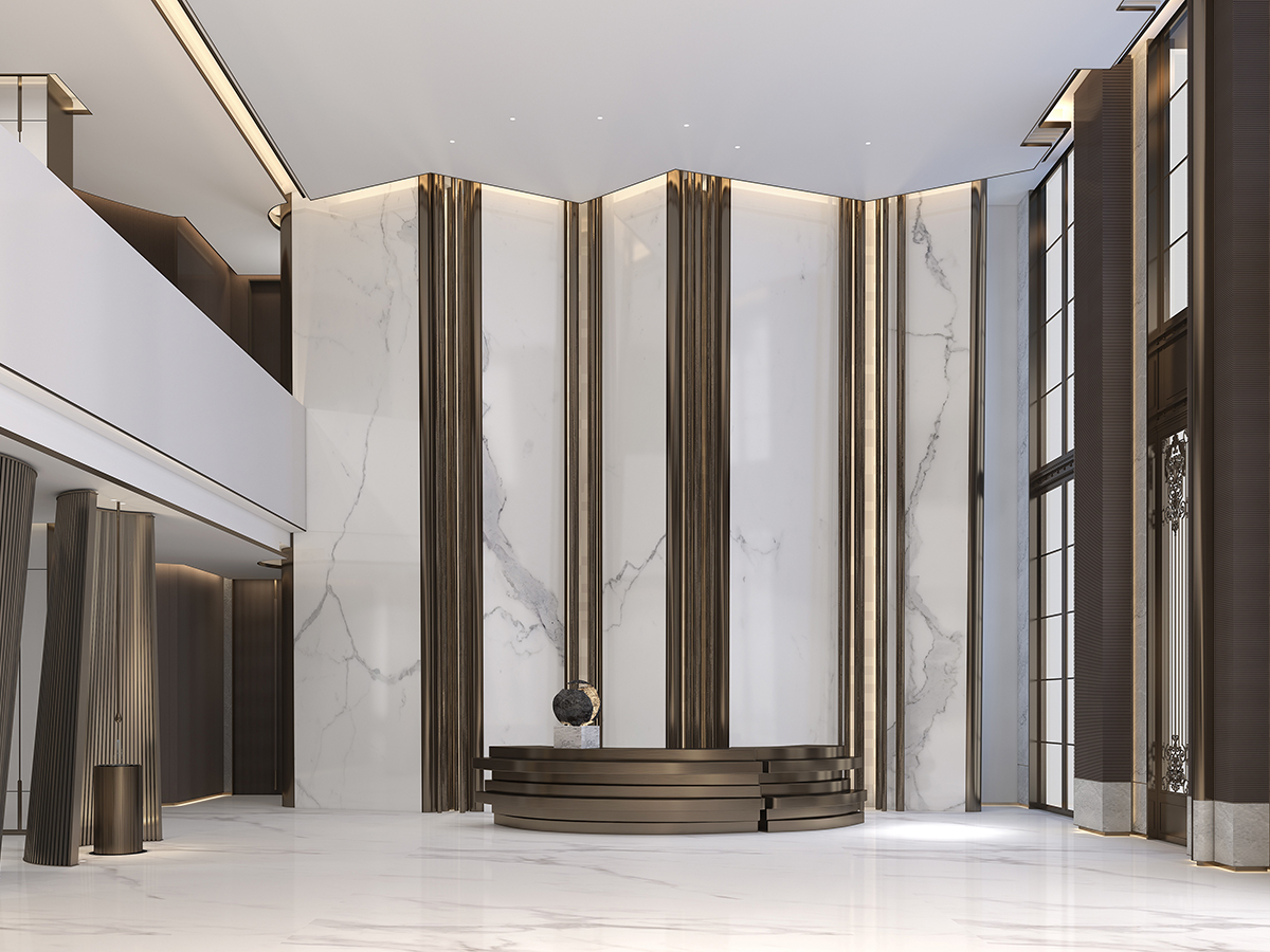 大堂以大尺度挑高設計,加上有序交互的幾何形體與線條,讓空間極具延展性。九尊水滴藝術裝置成為大廳另一點睛之筆,設計師伽馬取意“九眼水滴,禪心觀上”。從空中飛泄而下的藝術燈飾,構思于蘇州非遺文化“折扇”。晶瑩透亮似羽似扇的造型,表達輕盈與厚重,質樸與力量。