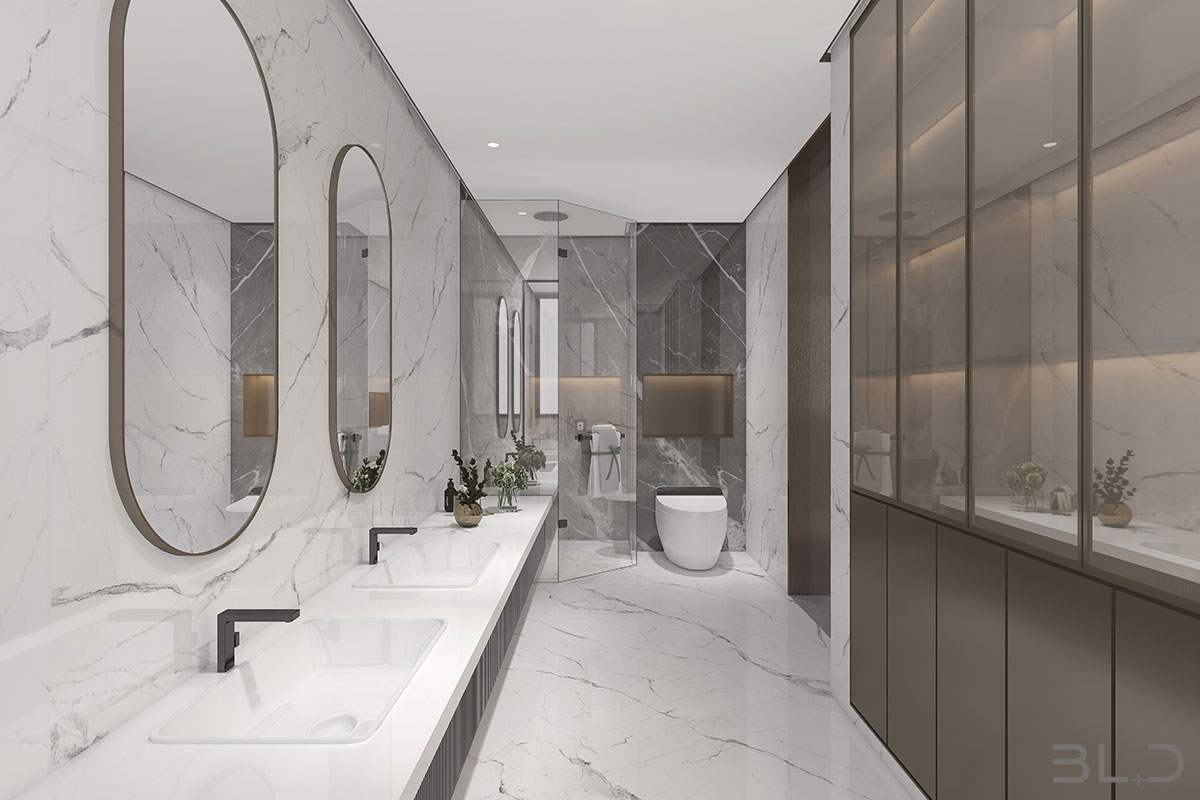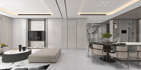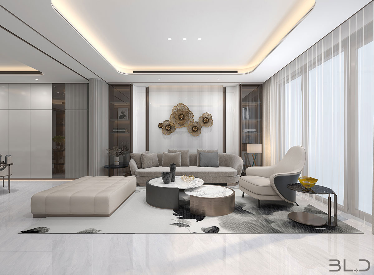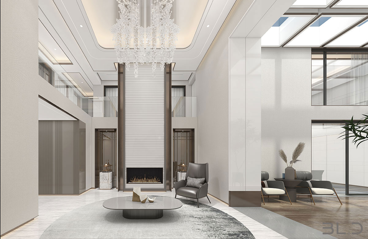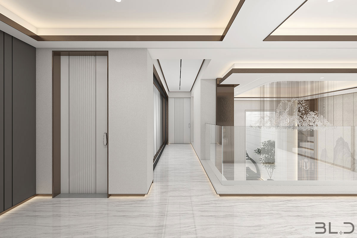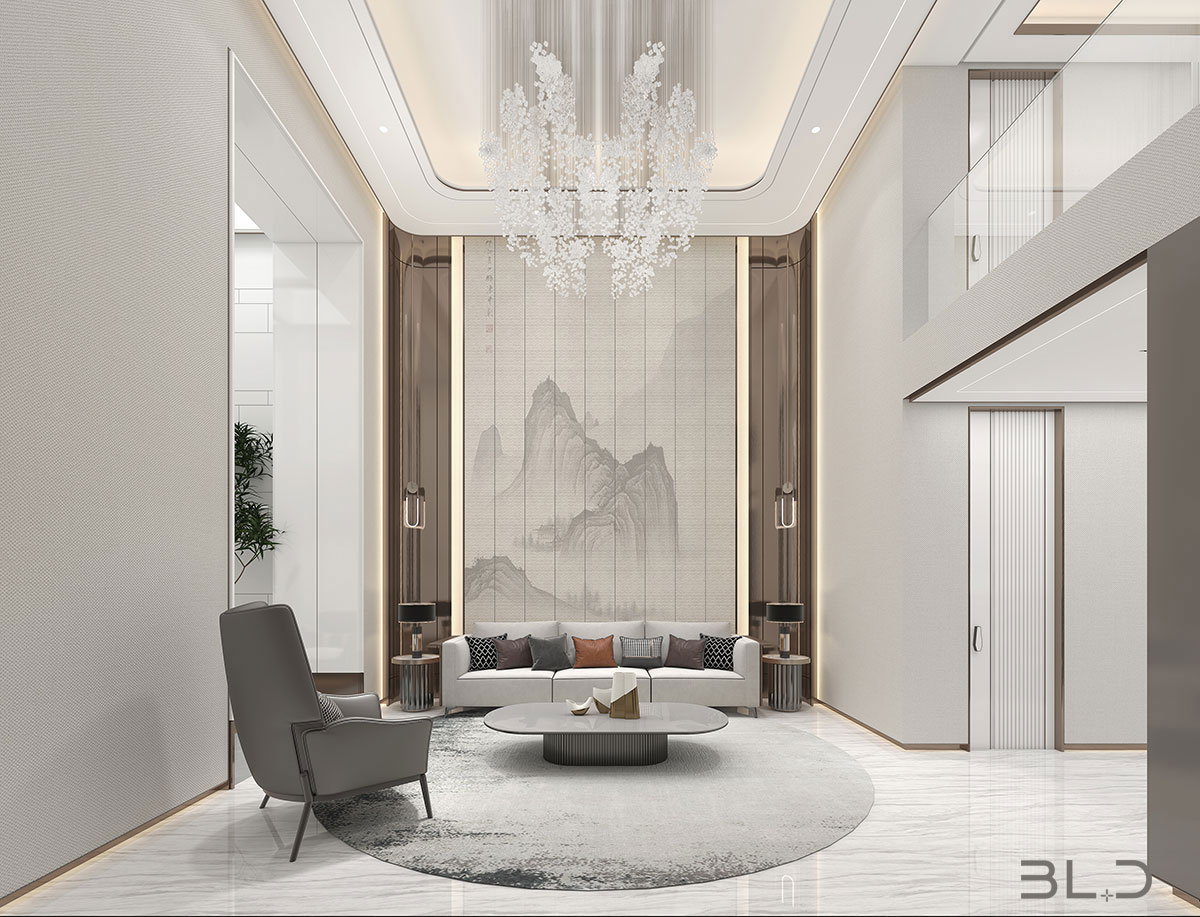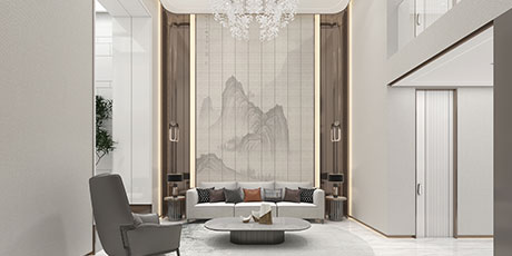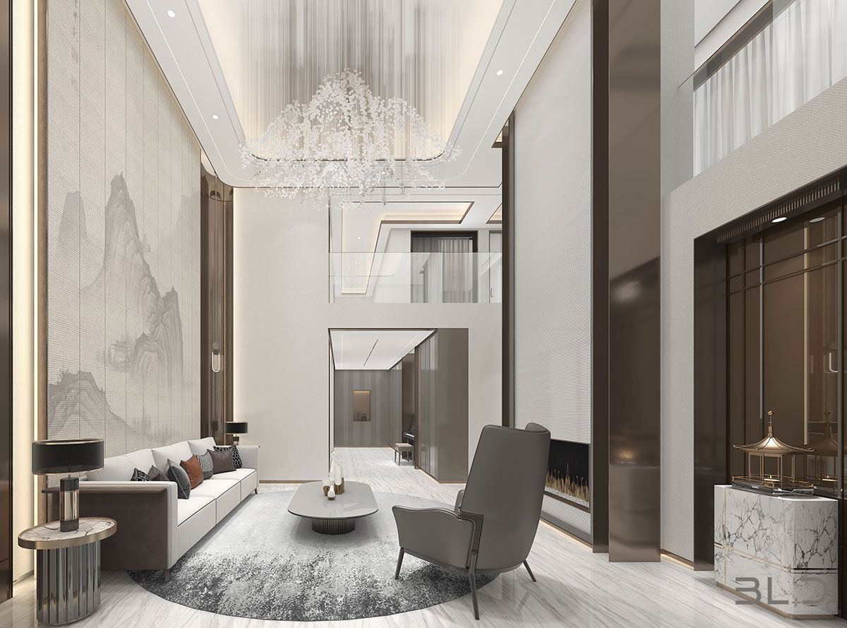 大尺度挑高設計,加上有序交互的幾何形體與線條,讓空間極具延展性。恰到好處的留白,吸取傳統藝術的精髓,拓寬了空間的層次布局,構造空靈,典雅而端莊的東方韻味。壁布山水裝飾、銅元素的點綴,糅合傳統與現代的藝術 氣息。米、白、棕的低飽和基調貫穿整體,將空間映襯的格外素雅簡潔,一些人文細節的融入,交疊中不失親和。