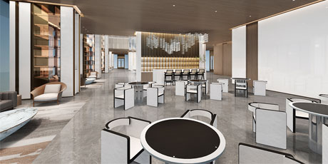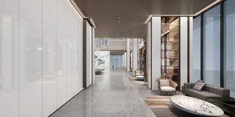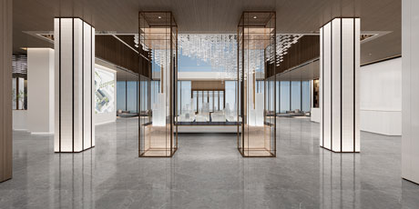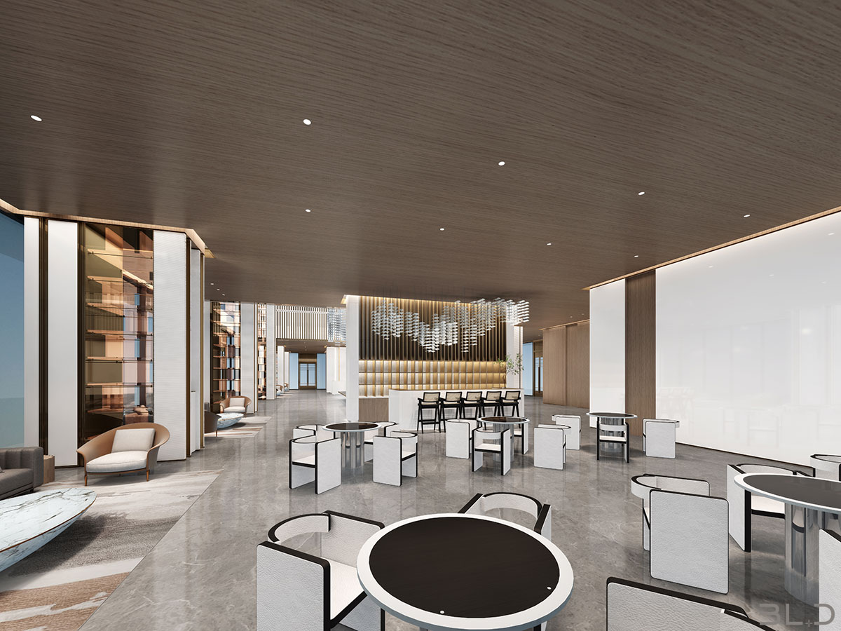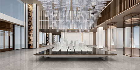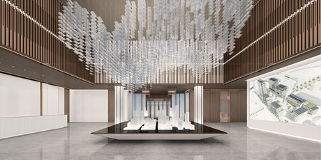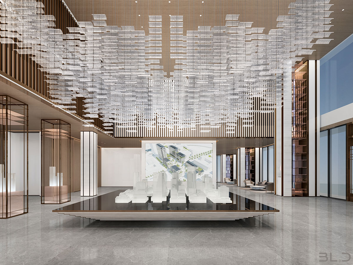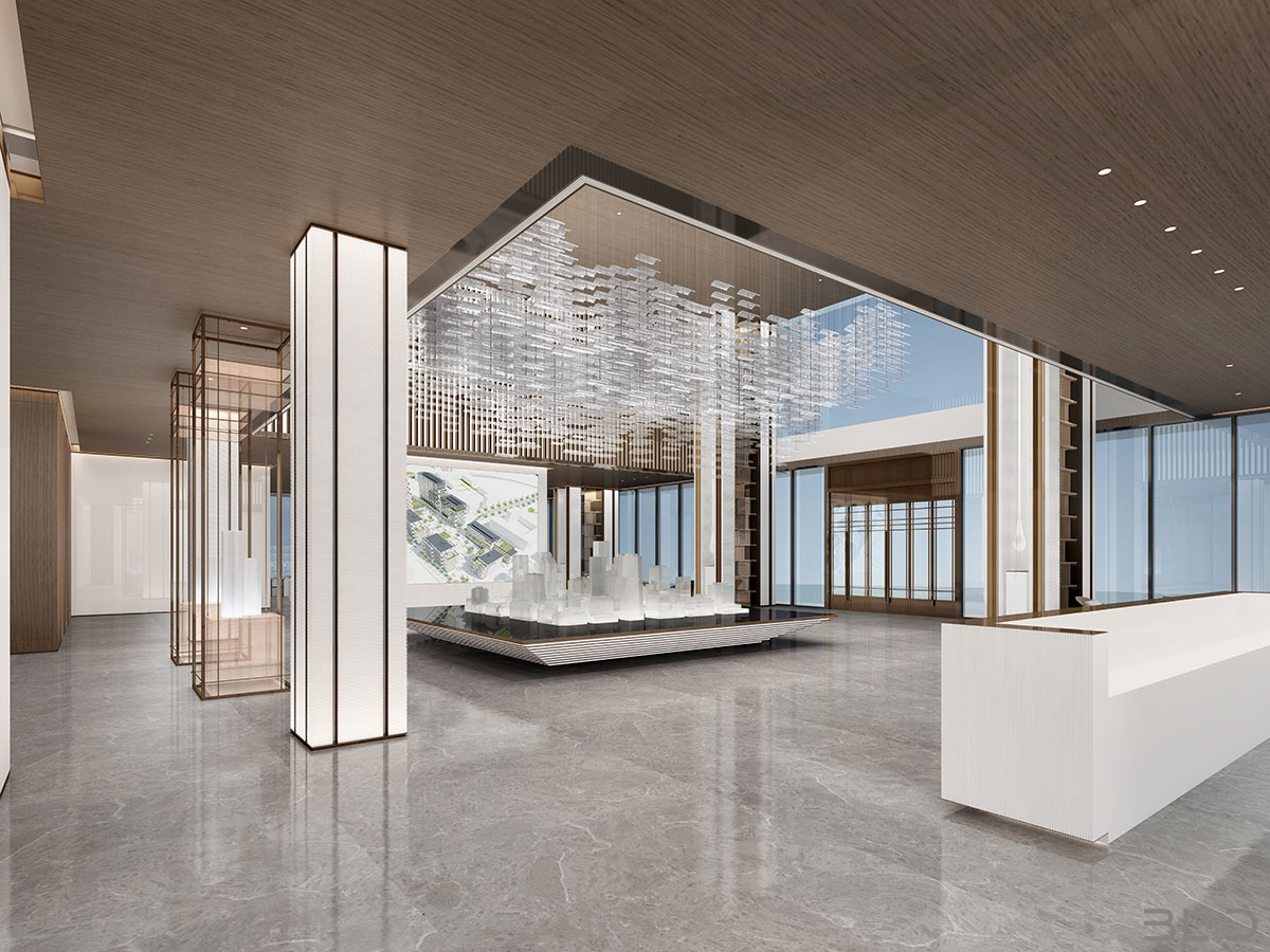 售樓處功能區(qū)分散在整個(gè)空間中,形成流暢清晰的循環(huán),平衡了隱性和顯性之間的關(guān)系,在布局中也融入了未知和交互,以留出更多的想象空間。未知刺激下的人與靜態(tài)物品的互動(dòng),可以為空間注入活力。整個(gè)空間營(yíng)造 出簡(jiǎn)約的空間基調(diào)。帶有紋理的大理石和木制藝術(shù)裝置被引入,以減輕廣闊空間的空虛感。空間中的物品與自然和藝術(shù)相連。只有在與人互動(dòng)時(shí),他們才能開(kāi)始扮演角色。淺色調(diào)平衡了建筑結(jié)構(gòu)的厚重感,也豐富了空間 的層次感。入口處下沉的燈飾結(jié)構(gòu)打破了空曠感,同時(shí)也豐富了視覺(jué)體驗(yàn)。水吧、休息區(qū)和洽談區(qū)緊密相連,共同形成社交的錨點(diǎn)。整個(gè)售樓處以藝術(shù)美學(xué)和極簡(jiǎn)主義為特色,激發(fā)人們與自然的互動(dòng)。