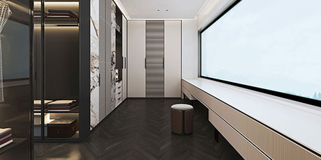 在別墅設計的主要空間之一臥室,在設計上卻不作浮華堆砌,只用干凈洗練的線條建立一個清簡恍如只隱約存在的空間關系,輔以原色為主的軟裝,任由樸素營造一個心靈可以完全放空的環境,在過道、衣帽間和洗手間這樣的次要空間則利用材料營造質感,讓人感嘆莫辜負了這片刻的美好時光。